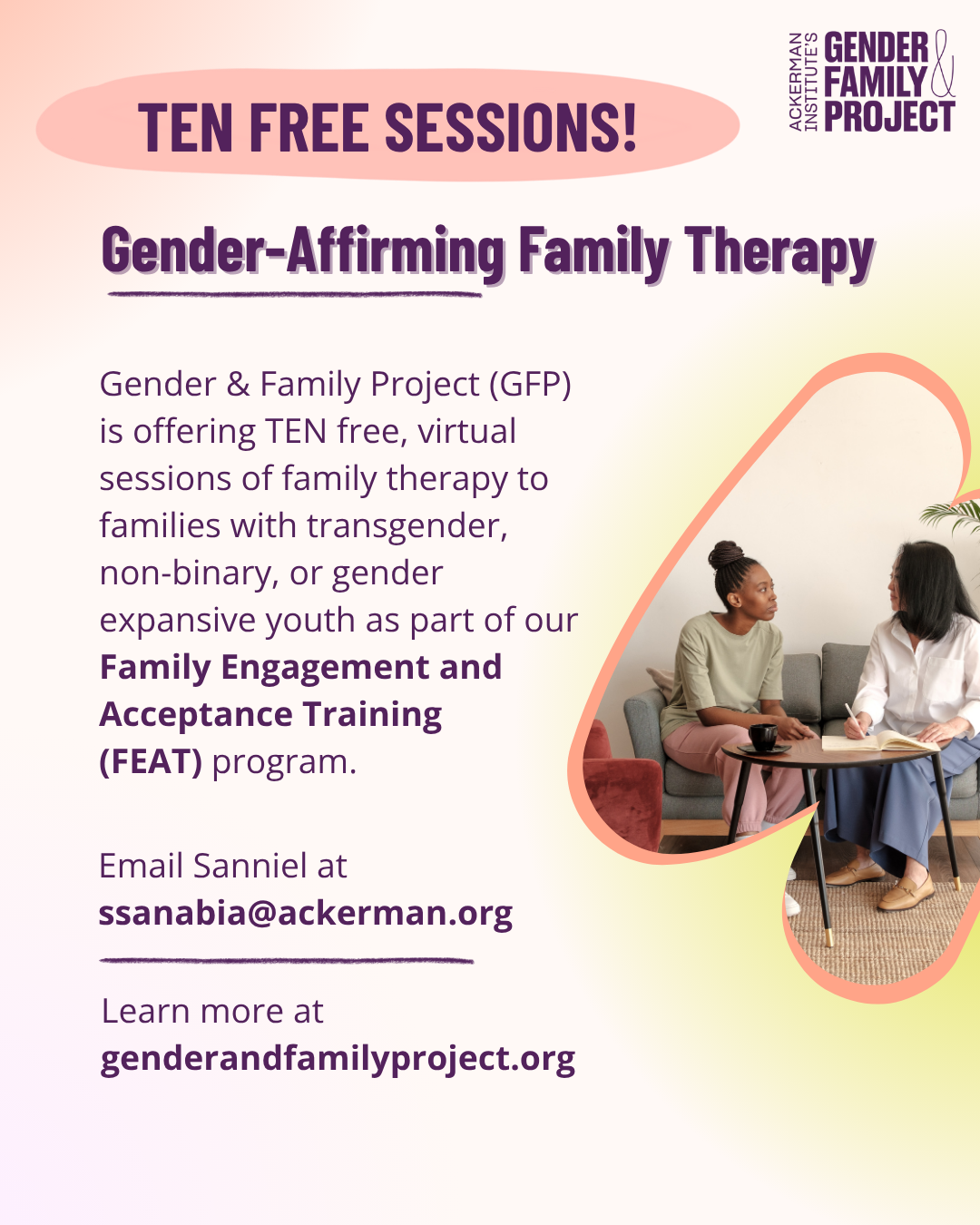 The Gender & Family Project (GFP) empowers youth, families and communities by providing gender affirmative services, training, and research. GFP promotes gender inclusivity as a form of social justice in all the systems involved in the life of the family.